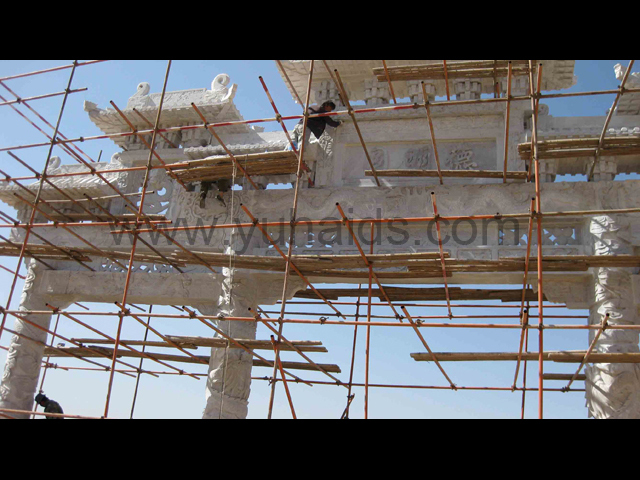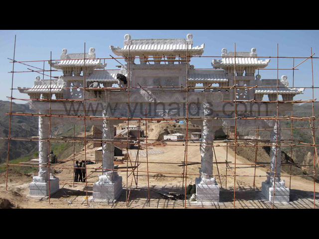 這是南京德明園大理石石雕牌坊應用案例。整個牌坊以大理石雕刻制作而成,主要以龍紋作為裝飾圖案,包括柱體和牌坊其他部件,大都可以看到龍的形態。